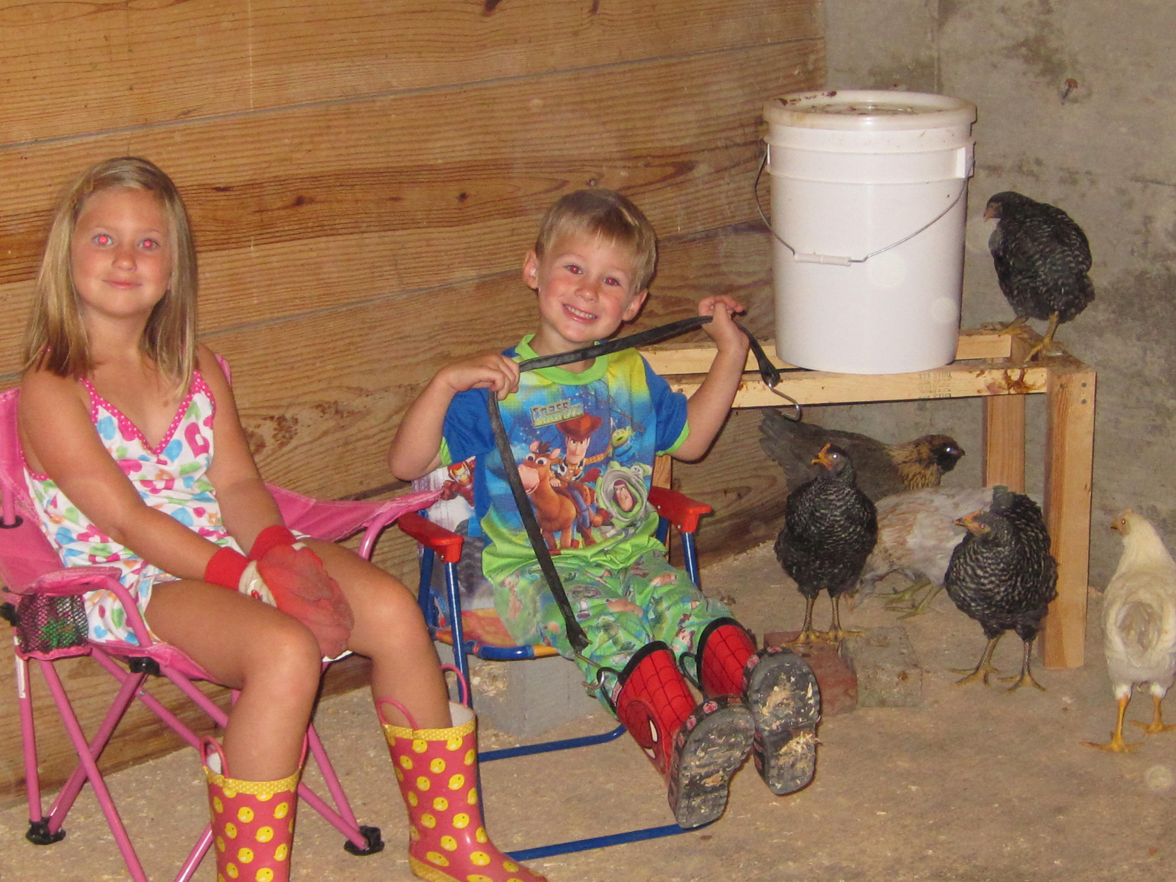 Long story short, he (and soon to follow…his sister) came out and just played and enjoyed the chickens.  I loved the idea that they were not sitting on the couch this Saturday morning watching cartoons, Roku, or a movie (we do do that but I try to keep it under control) but instead were in the coop, in their lawn chairs, playing with the chickens.  We all hung out for about an hour and just enjoyed each other.  Me cleaning, they – in their PJs – singing and talking with the chicks.  I love the new “normal” we are creating for our kidlets.  It’s very intentional and not easy – but I think it’s worth it!  Time will tell…